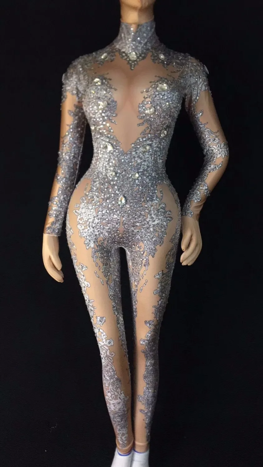 nightclub Gray Pattern Printed Nude Jumpsuit Women's Big Stones Skinny Outfit Female Singer Outfit